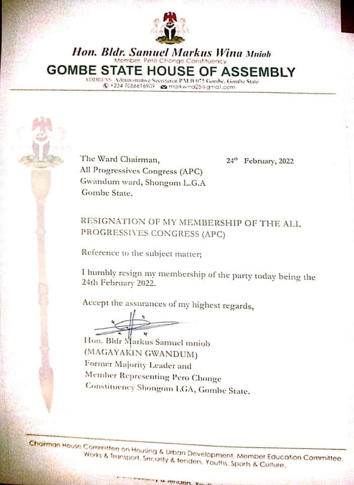 The gale of defections from the All Progressive Congress (APC) has continued to hit the ruling party in Gombe State as a former majority leader in the Gombe State House of Assembly, Markus Samuel, tendered his resignation Thursday morning.